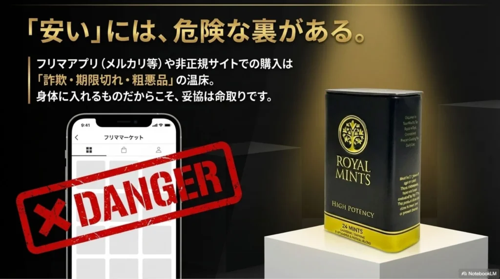 現在、ロイヤルハニー特有の「液漏れ」や「飲みにくさ」といった弱点を完全に克服した**「次世代のタブレット型サプリ」として、ロイヤルミントの需要が急拡大**しています。これは非常に喜ばしいことですが、同時に悪質な業者が「次はロイヤルミントの偽物を売って儲けよう」と狙いを定めるタイミングでもあります。
