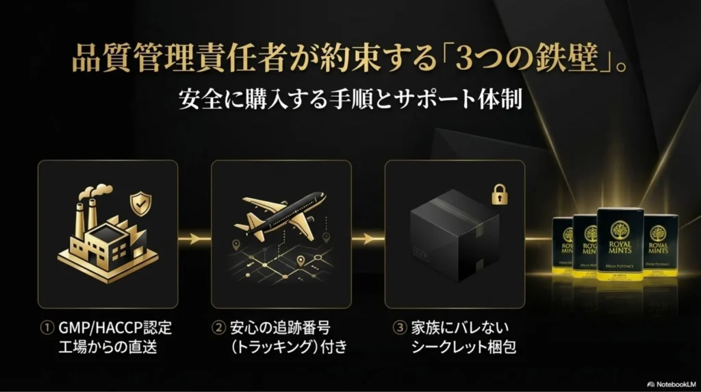 途中で素性の知れない中間業者や卸売業者を一切挟まないため、「中身がすり替えられる」「劣悪な環境で長期保管される」といったリスクが物理的に存在しません。常に製造したての新鮮で100%本物のロイヤルミントを、安心してお受け取りいただけます。