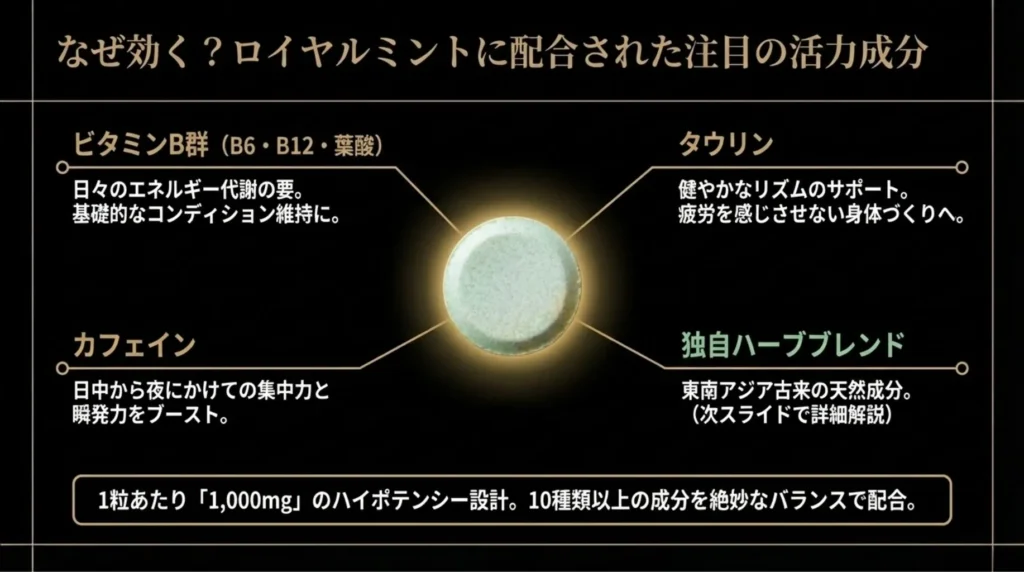 「なぜタブレット1粒で、これほどまでの実感が得られるのか?」 その秘密は、計算し尽くされた「瞬発力×持続力」の黄金ブレンドにあります。ここでは、公式の原材料・成分表示をもとに、ロイヤルミントの実力をプロの視点で徹底解剖します。