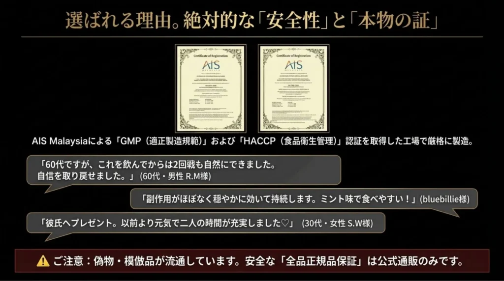 ご自身の体内に入れる大切なサプリメントだからこそ、「安全性」と「確かな実感」を第一に考え、必ず公式通販サイトからご購入いただくことを強く推奨いたします。